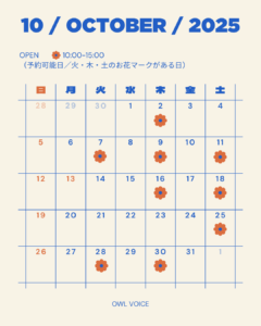 202509/26 10月のご予約可能日のお知らせ 火曜日 7、28日 木曜日 2、9、16、30日 土曜日 11、18、25日 となります。いずれも10時から15時までの間でご予約いただけます。 くわしくはお問い合わせフォームからご相談ください。